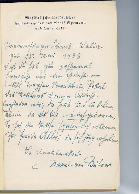 Die wiedergegebenen Widmung schrieb Marie von Bülow Karl Schmitt-Walter in eine Erstausgabe ihres Buches "Hans von Bülow, Leben und Werk" (J. Engelhorns Nachf. Stuttgart, 1925). Da vielleicht nicht jeder die Handschrift lesen kann - hier ist der Text: